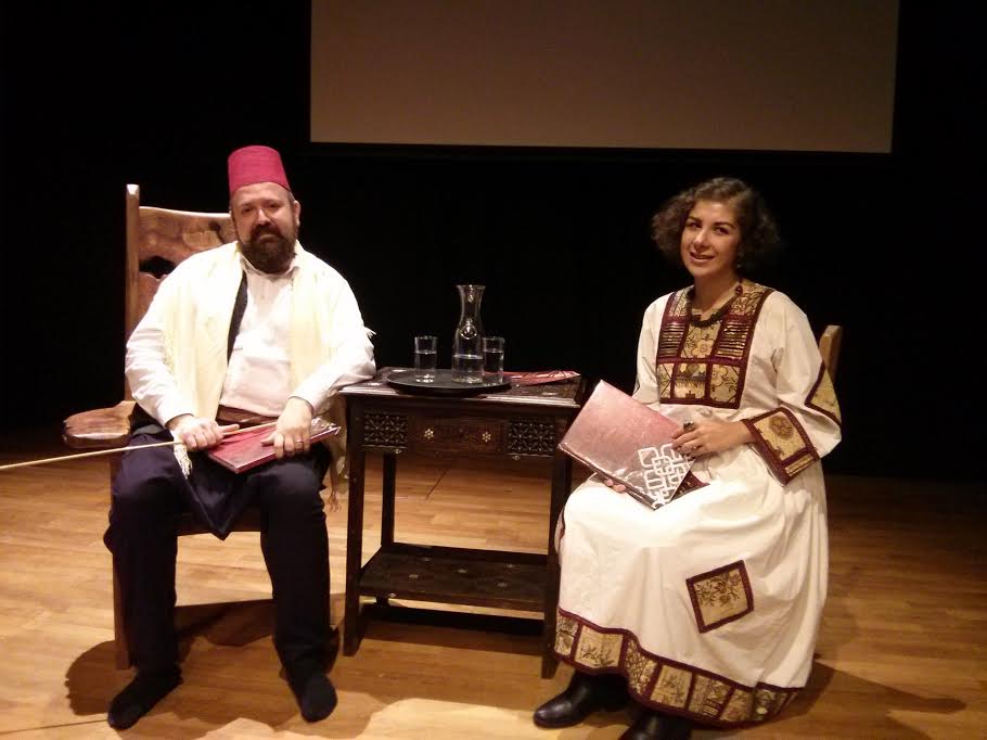 The show was based on a very simple but evocative scene of a Syrian storyteller, or hakawati. A traditional big carved chair, a big book, an equally big hat, and a wee stick for chiding any sleepy listeners back to full attention. We glimpsed one of the few smiles that came from Bassam Dawood the storyteller or hakawati’s lips as he lifted his stick, but then continued with his sad story, translated piece by piece from Arabic into English by Dima Mekdad, who sat in the other carved chair in an old-fashioned embroidered peasant gown; the story of a musician’s journey out of Syria, accompanied by a single guitarist in the near corner of the stage.