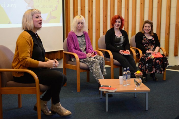 The audience for the day’s second installment had swapped a tad elderly bunch of appreciatives with a mainly female group, where shocks of pink hair flashed by ladies of demure countenance. They had gathered for an hour or so with Becca Inglis, Jen McGregor & Alice Tarbuck; who like Euphrosyne, Aglaea and Thalia presided over our gathering, relaying their essays cooked up to order by virgin publisher 404 Ink in order to respond – through intelligent & therapeutic literature – to the brutally nonsensical & inane sexism of Donald Trump. Beginning as a tweet, the rise of a book called Nasty Women to prominence has been a 21st century, social-media wonder, & was already a cleverly hyped sensation before it was launched on International Women’s Day this year. By August it was the biggest selling book at the Edinburgh International Book Festival.