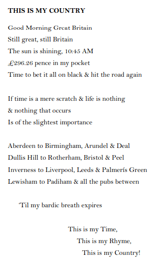 Sure – I’m very proud of it – I think it’s my best work. You can read it in full here. The catalyst was meeting my good lady, who is from Seattle. Her ancestor was Colonel Daniel Gillespie, who was at Valley Forge. Thus, Stars & Stripes is what you get when the bloodline of an American patriot meets an English epic poet. My partner & her spirit gave me the connection to the American fibre, while being from Burnley shouldn’t really matter as America is the ultimate immigrant nation.