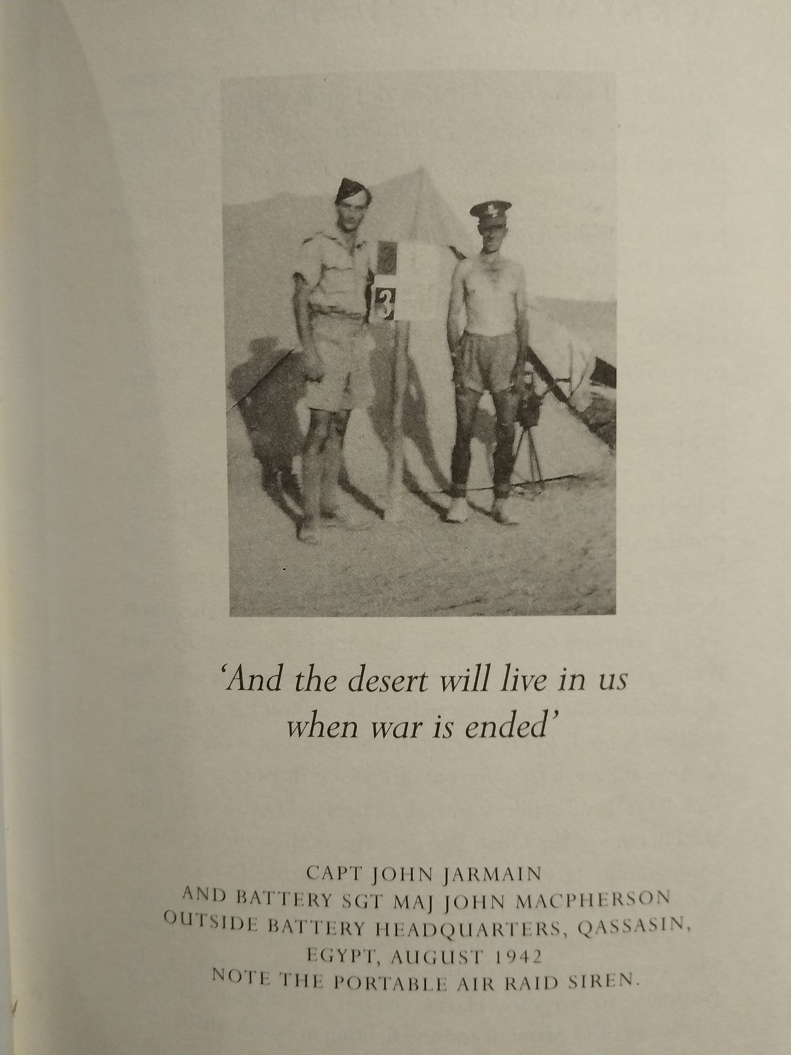 John Jarmaine & Hamish Henderson are two blooms of the same plant, a sweet-smelling desert asphodel whose wafting fragrance touches the souls of all who near it. Away from the sands, Henderson lived a long & fruitful life, reinigorating the Scottish folk music tradition & embellishing his nation’s striving for independence with his poetical insight. Jarmaine was not so lucky, but it in his posthomous life that still speaks to us all. In 2013, a cache of 150 letters written by Jarmain to Beryl hwas discovered in a family bureau. In them we see the originals of his poems, & also his voice as a man, who described his situation in the desert as being one with, “everything liberally sprinkled and intermixed with sand. Can you picture it all?” These letters can only serve to give the future a much wider insight to the one that we have to hand. James Crowden’s book is an excellent start, but I am sure as the decades & centuries flow by, that every word written by Jarmain’s hand will take on some form of quasi-religious status as we look back on one of the last true poets of the ‘archaic’ human dispensity for mass, murderous warfare.