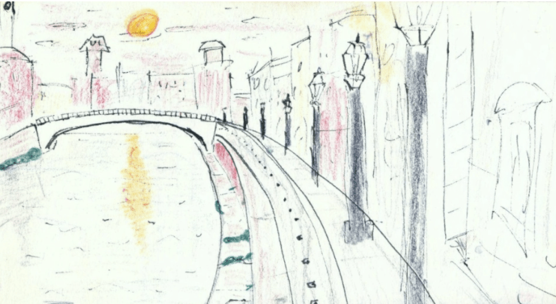Where sits Lord Byron, sketching the sunset,