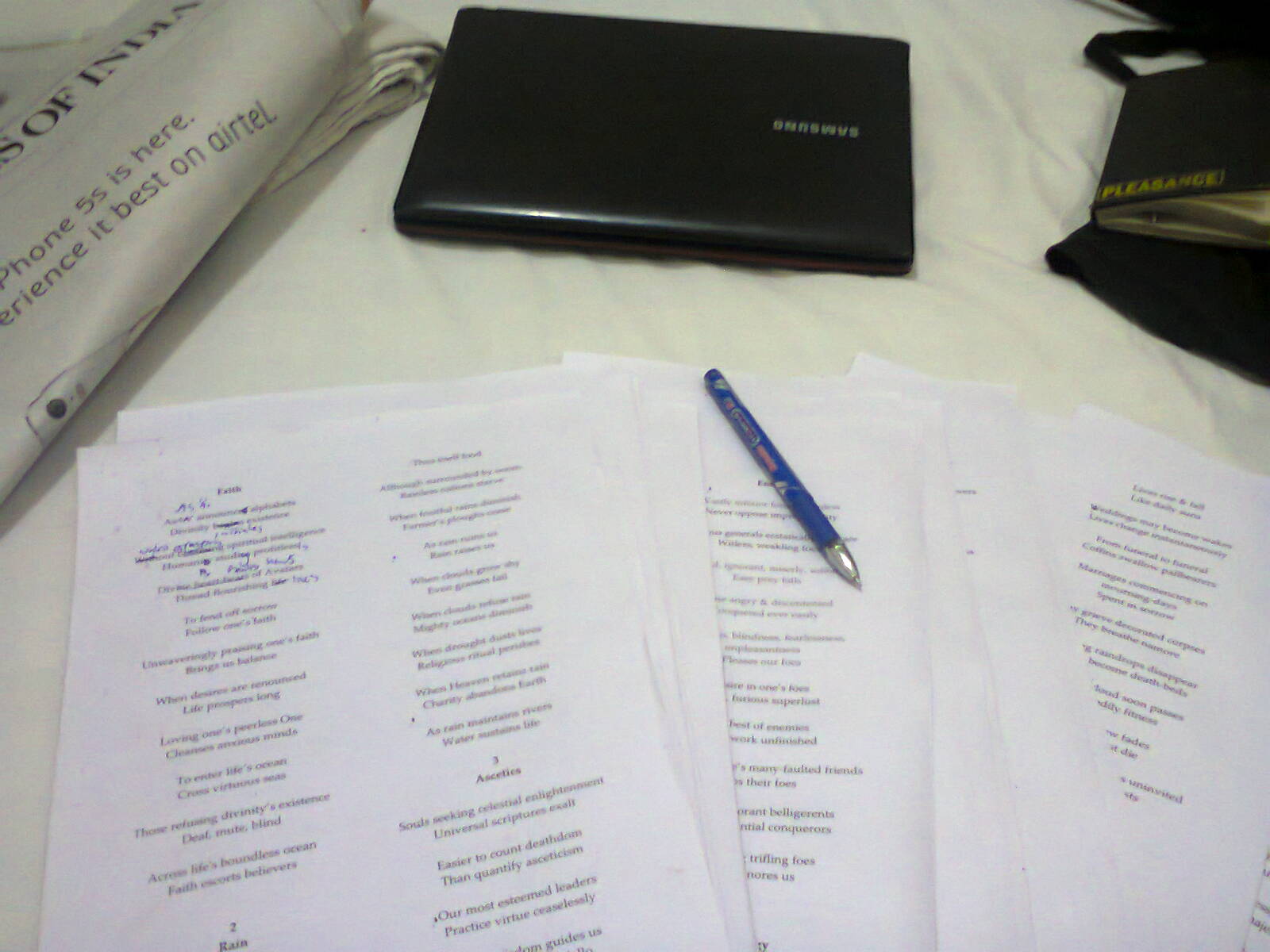 After completing the pen & paper version of the Thirukural, I printed out the first draft of my transcreation this morning, & was looking forward to a leisurely editing process, printing it out, drinking a few beers over a few plates of tasty food, scribbling away in a poetic half-dream. Of course I was wrong, this is India, too many variables, too many chances to progress on a plan. It begins with my new-found love for a possible new-found vocation of being a ‘literary archaeologist’, to whom the libraries of exotic countries are like the mausoleums of antique emperors, the treasures of which have lain undiscover’d under centuries of dust… & so to the central library at Madurai. I’d decided to spend a few hours there, unwinding & studying a few Tamil poetic measures, when I stumbled across the Nalatiyar. Well, less stumbl’d, more guided there by the statue of Thiruvallavar downstairs. It turns out that this collection of 400 quatrains is actually the revered sister-poem of the Kural, tho’ nowhere near as famous. There is an old Tamil proverb praising which says;