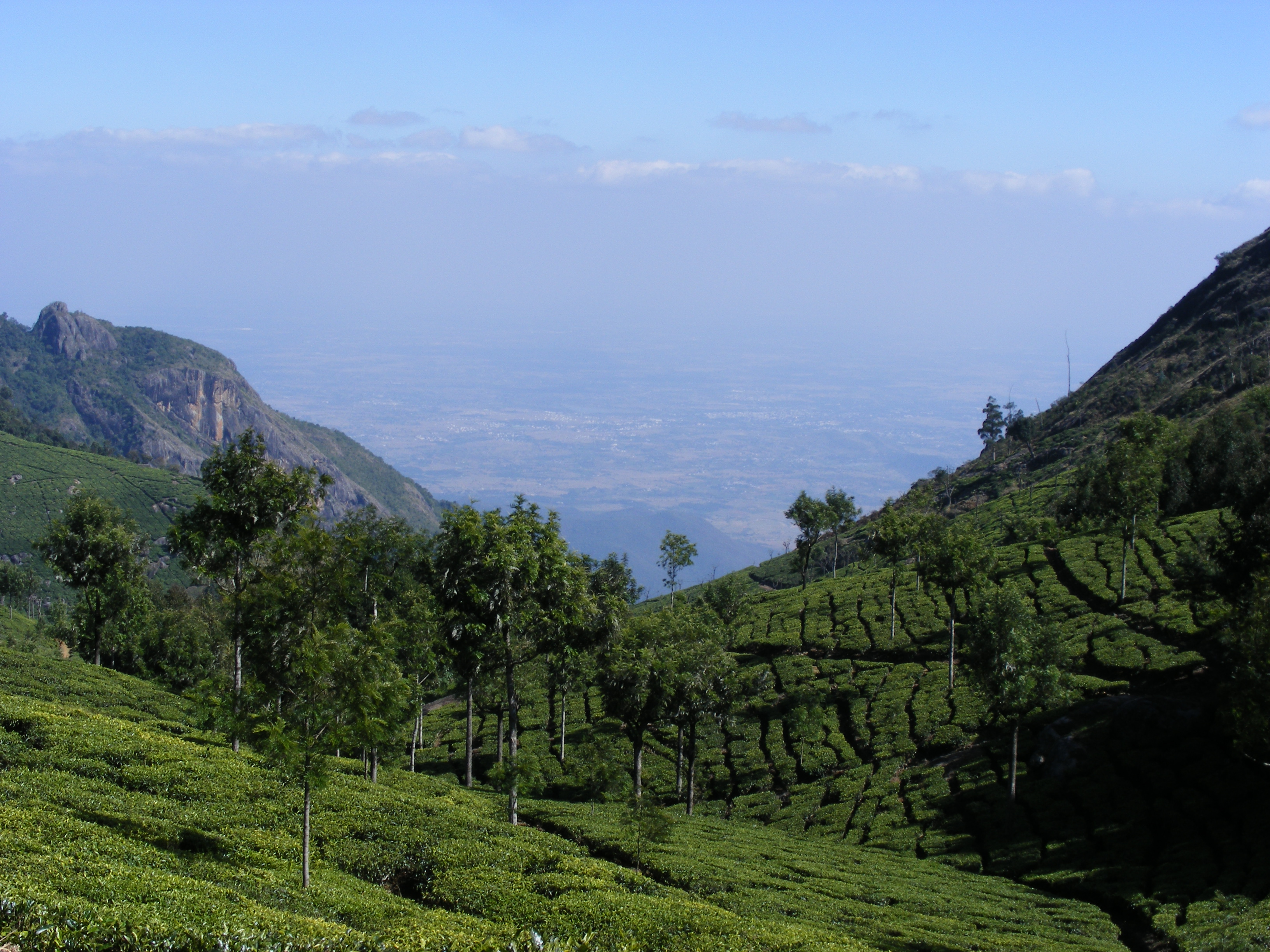 The whole are is really just one big tea plantation, peppered with little villages & rows of Butlins’ chalets to house the pickers (1.50 a day for 8 hours). British mountains are often purpley with heather or brown with bracken, but in comparison the Niligris are very, almost purely, green. The best way to describe the scenery is to picture normal British hill country, then cut a huge wedge of rock out of it a mile deep, then cover this with lush forest. Every ten yards a new vista opens up; from the immense white snakelike streak of water that hangs from Catherine Falls; to the view from Droog, which took in twenty miles of Niligris – the town of Coonoor the pastel-spangled jewel in its crown.
