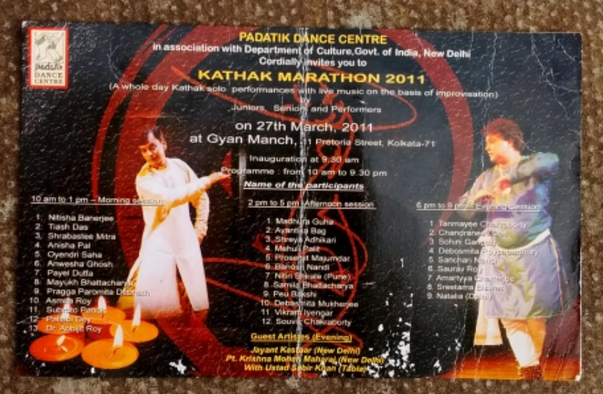 Today is our last full day in Calcutta, which was something of a cultural sandwich. The crusts were formed by Indian classical music & folk dancing, with the filling being a trip to the races. The day began with a rush for orange juice to counter the effects of the previous night’s drinking session. It was there, on the breezy rooftop of the modern lodge, that Malcolm, a bearded twenty-something from Athens, Georgia (US) & Rebecca, a salt-of-the-earth Irish lass from Tipperary agreed to join me on my kathak quest. We were join’d in the morning by Owen, a handsome-in-that-Irish-way traveller type from Cork – & Sebastian. I’d met him on my mission to get juice – a young, long haired Pole, resident in London & with appropriate cockneyisms chuck’d into his accented English. He’s in town to get a sitar made – a two-week process – & I said as there is sitar accompaniment to the kathak, he should come along. He did, & soon enough the five of us were sat in a lovely air-conditioned auditorium.
