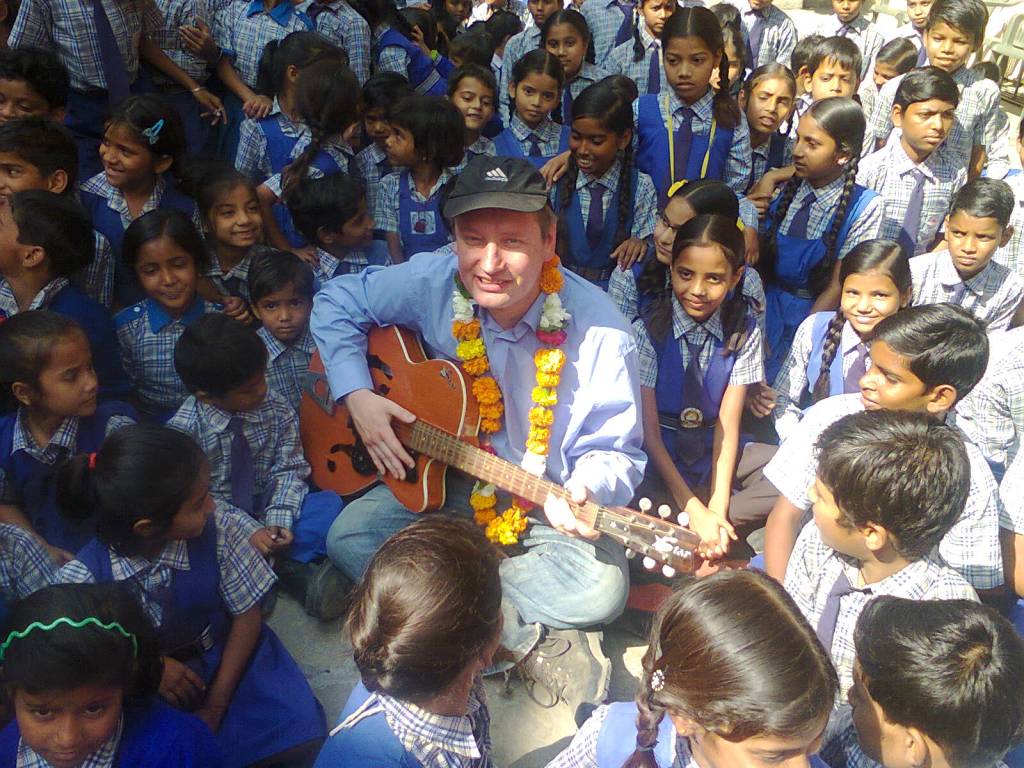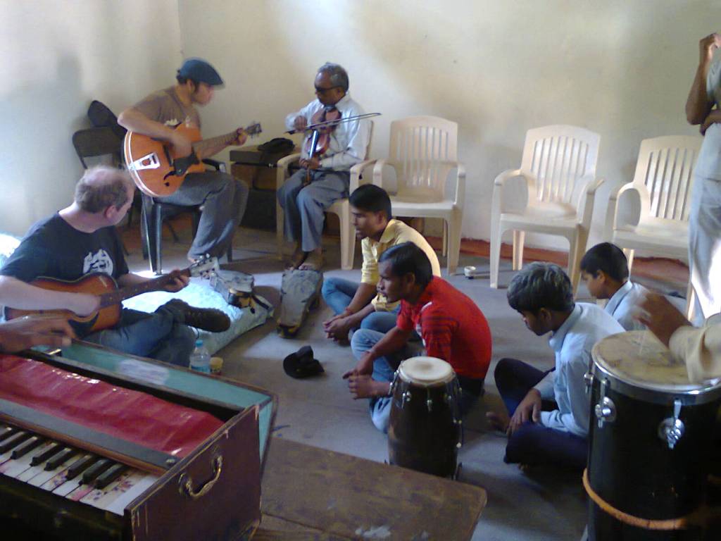 This morning, after one last gaze at the sheer wonder of the Taj Mahal, we caught a bus to the fine bustling sprawl of Gwalior, where we were met by Bhagat, the 40-year-old principle of a couple of schools in the city. After putting us up in a hotel, me & Mr Steve (as VP has been happily monicker’d), went back to the school for a ‘gig.’ They had built a stage, hired a PA & sorted us out instruments – a guitar & a harmonium – plus three drummers who we quickly got up to speed.