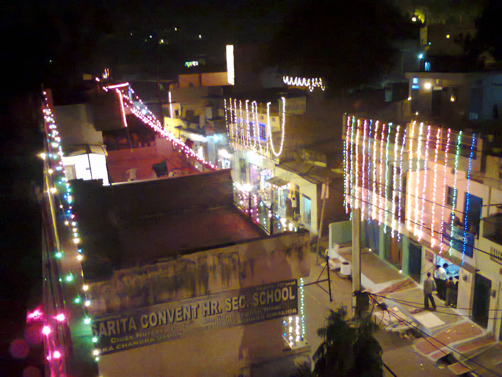 After this, we shared in the worship ceremony, in which Bhagat’s father, the founder of this school, & a wonderful man in his own right, read out a hymn from the Vedas which was sang along to be the women of the household. After this, we all consumed far too much food (at separate times I may add) while a million firecrackers erupted through Gwalior, whose quality puts our own Guy Fawkes efforts to shame. In particular I loved the ‘butterfly,’ which upon being lit would flit & sparkle randomly about the place, just like the real thing.