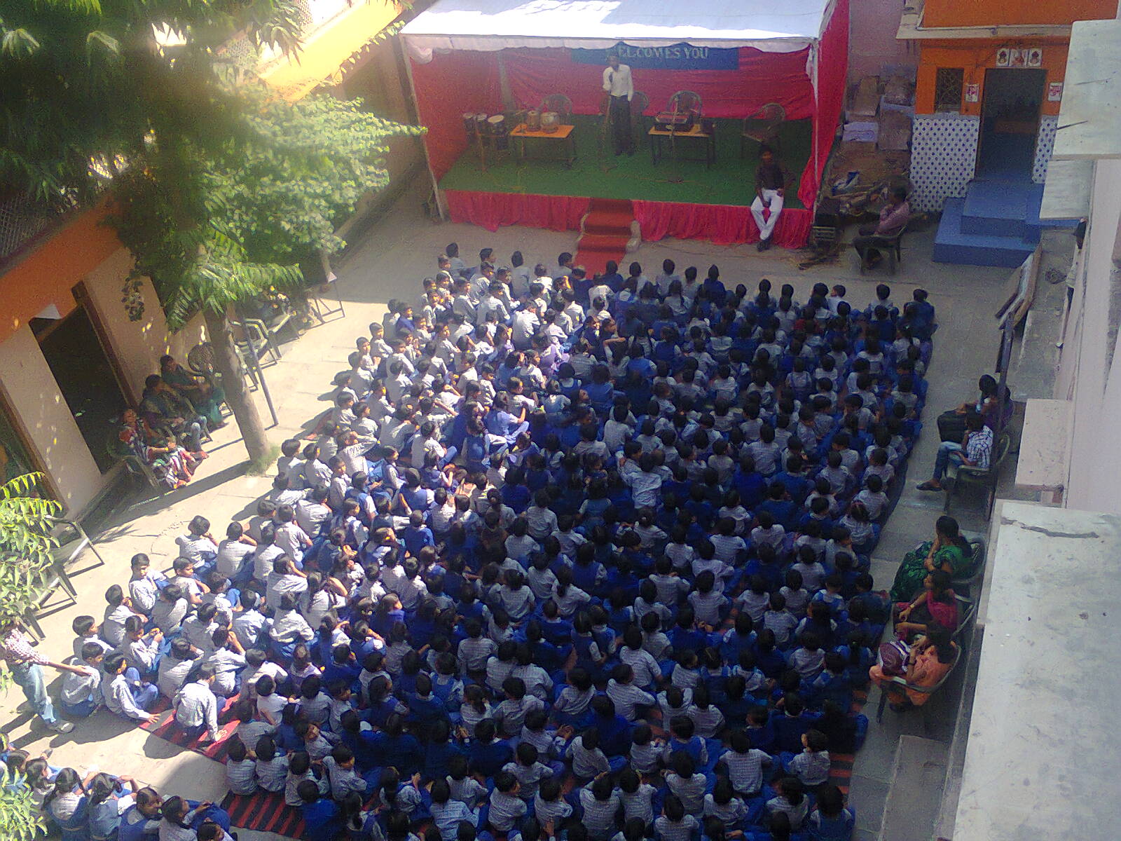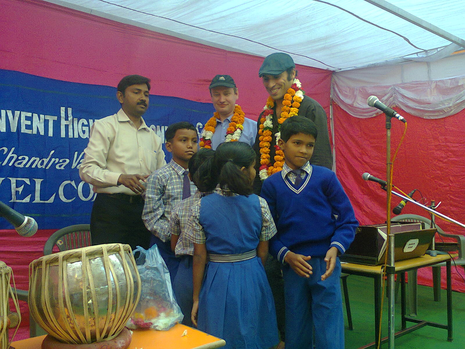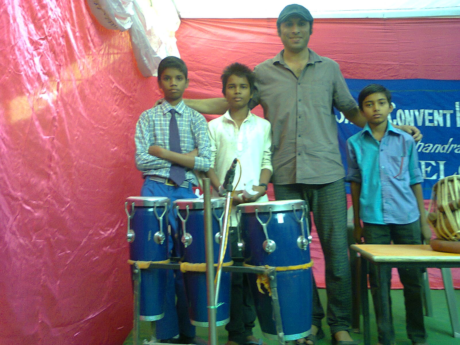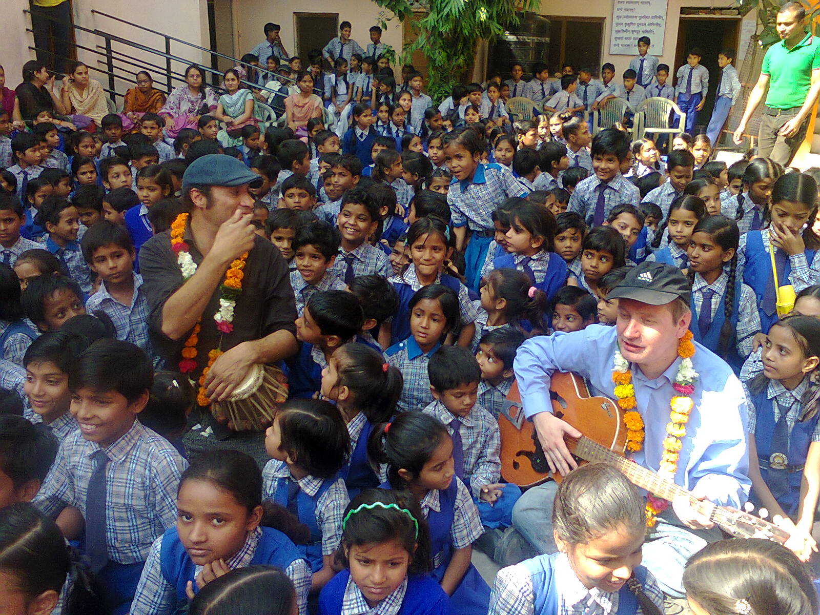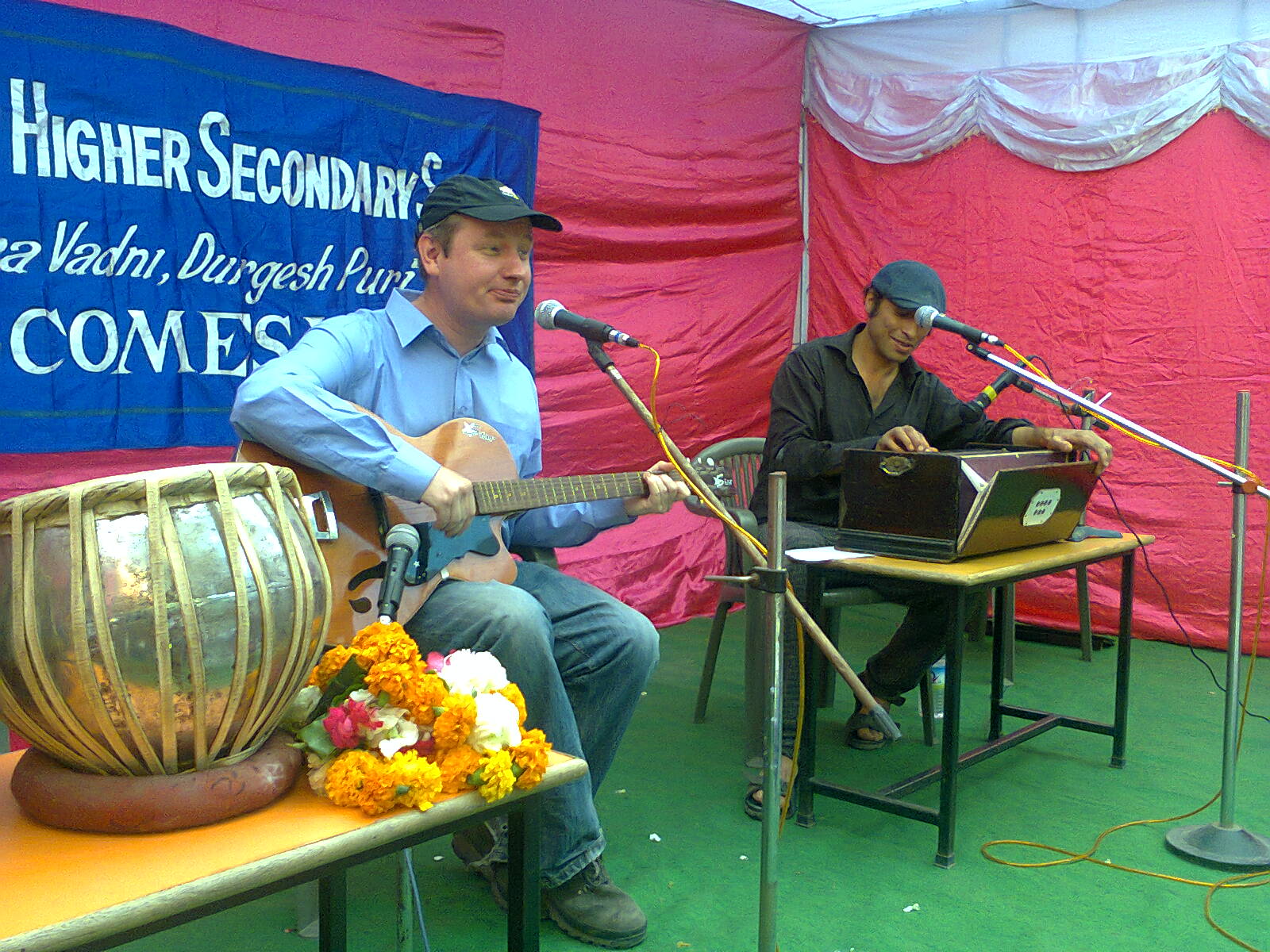 This morning, after one last gaze at the sheer wonder of the Taj Mahal, we caught a bus to the fine bustling sprawl of Gwalior, where we were met by Bhagat, the 40-year-old principle of a couple of schools in the city. After putting us up in a hotel, me & Mr Steve (as VP has been happily monicker’d), went back to the school for a ‘gig.’ They had built a stage, hired a PA & sorted us out instruments – a guitar & a harmonium – plus three drummers who we quickly got up to speed.