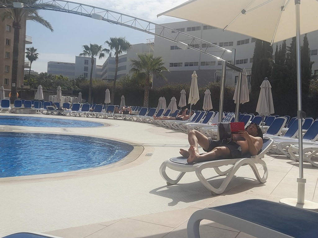 So, I made Majorca. In fact, I was here yesterday completing the Rabbie Burns paper. My journey here began Sunday morning (its now Wednesday), on the Isle of Arran, from where I proceeded to boat it to Ardrossan, then catch two trains thro pure Burns country to Kilwinning & Prestwick. I eventually flew to Palma on Majorca & join’d my Burnley family in Magaluf. Half board & pool vibes at the Samos Hotel – its not quite me, but I’m not complaining. I am six days from the quarter century anniversary of my becoming a poet, & in the next few days I will be completing my POEMS 1998-2023 collection, & also composing the last of these Pendragon Papers.