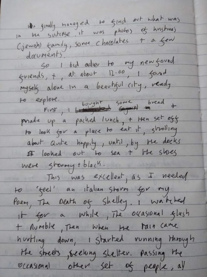 This was excellent, as I need to ‘feel’ an Italian storm for my poem, The Death of Shelley. I watch’d it for a while, the occasional flash & rumble, then when the rain came hurtling down I started running thro’ the streets, seeking shelter. Passing the occasional other set of people doing the same.