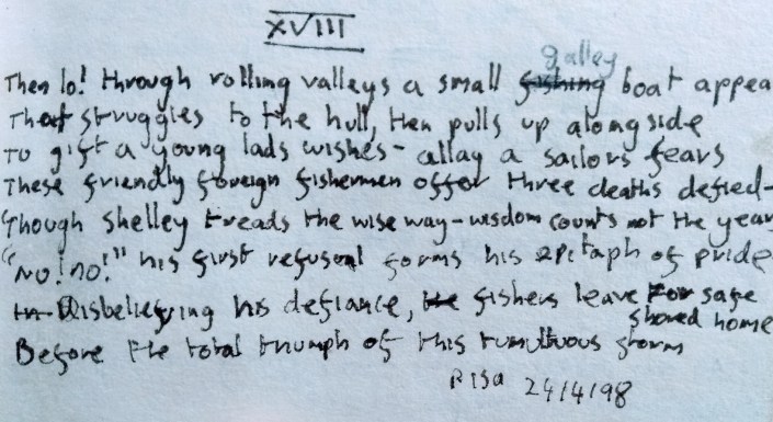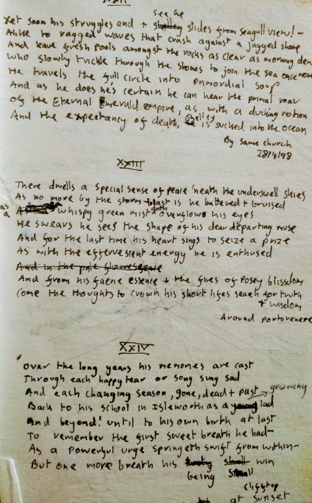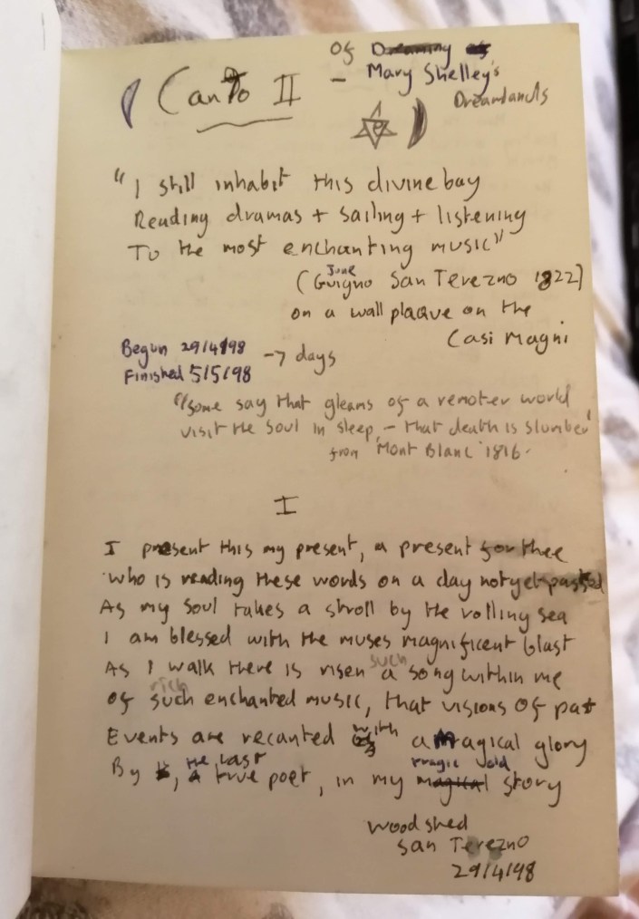 It is 21 years ago this week that I returned from the Continent as a poet. I had just been deported from Switzerland for apparent vagrancy, but unbeknownst to the Swiss I was trying to get home anyway. I have always put my lucky break down to the ways of the Muses, who had recently taken me under their wing. Landing safely at Heathrow, in my possession was what I call my first proper poem, 100 stanzas of Ottava Rima upon the Death of Shelley. After two weeks of touring Europe as far as Hungary, I then headed to Italy, Shelley’s own ‘Paradise of Exiles’ where I began my composition period in Pisa on the 16th April; concluding the poem by Shelley’s tomb a month later, at the Protestant Cemetery in Rome. In between was the the great moment of validation in my life, sat on a clifftop over Portovenere, composing to the gulls & the sunset. Like a young Wordsworth over Helvellyn, I too knew I was a poet & parley to the especial feelings of universal inclusiveness which being a true poet entails.