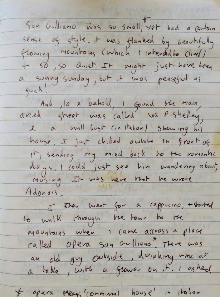 Those six & a half weeks of travel was my very own Grand Tour. I was no aristocrat, far from it, a little half-caste drop-out from the back streets of Burnley with sudden pretensions of poethood. I should have been better off in a factory like the one in Rawtenstall I’d worked at for 3 months or so in 1996 – the shoemakers Lambert Howarths. But I was, of course, a poet, for a poet is born… & then made of course. Having realized this was my fate in early 1997, a year later I embarked for Europe where I hoped to experience for myself just a sliver of the literary domicile in Italy which Byron & Shelley had set up in exile. Just what kind of poet I would turn out to be would be heavily influenced and nourished by the experience. My only source of income, however, would be the rent money I neglected to pay in London, & whatever I could whip together in the Italian streets thro’ my guitar.