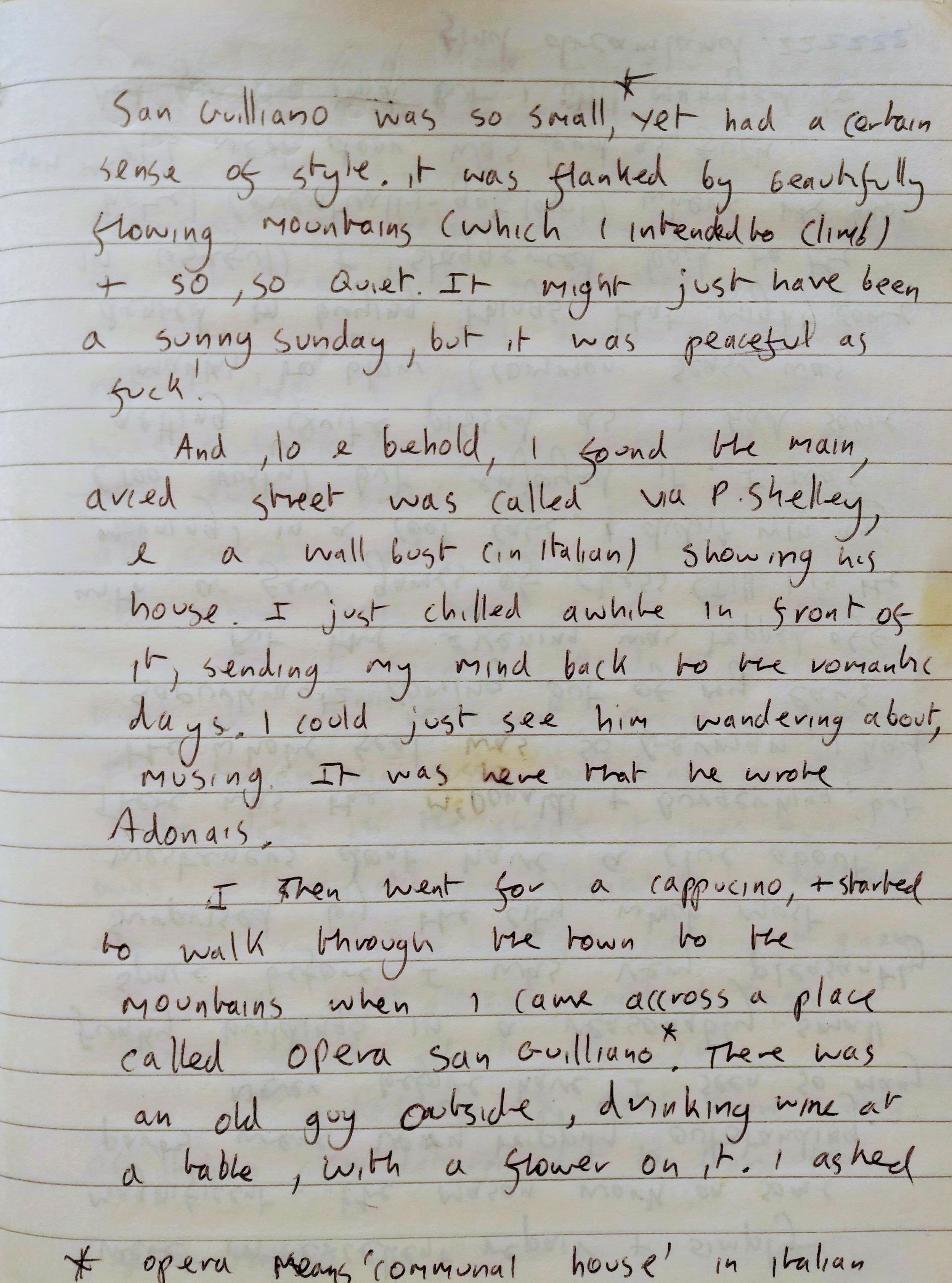 Quite an interesting day, perhaps a monumental one. The day began by waking up to see Jesse had got into bed with Kapitano’s new woman! Kapitano kept calling him ‘mother fucker’ all morning. I ate & made up a little lunch, then set off for a day in the Tuscan countryside. I wasn’t sure exactly where, but I read that Shelley had once lived in San Guilliano, & when I saw it was only 10 minutes away by train, I knew I had to go.
