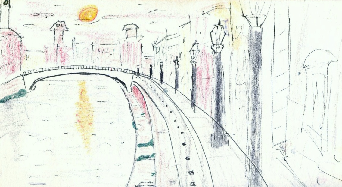 At about 6, we headed back into the centre, where a concert was just finishing. Its Liberation Day. They were playing Pomp & Circumstance by Elgar (Land of Hope & Glory) just as I arrived. I got bored after a bit, so went off to skethc the sunset. It was more or less the same one that Shelley spoke of when Byron said he thought Venetian sunsets were incomparable. Shelley retorted;