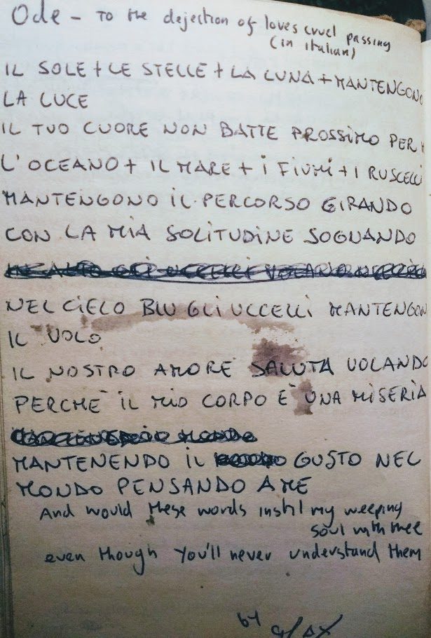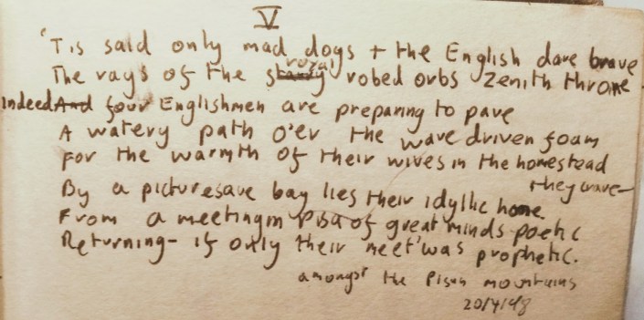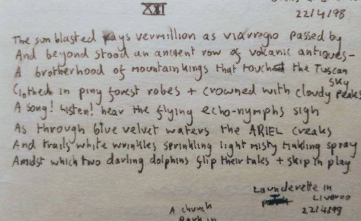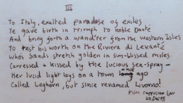 Usual routine in the morning, but woke a little earlier & managed a couple of stanzas. I’m really getting into the swing of things now. It turn’d out that we would be leaving for Livorno in the evening, after stazione pasta, so we spent the day basking in the sun, & for the first time didn’t drink wine! I felt satisfied just to be kicking back tanning my skin into an improved, blackhead-free complexion, while at home everyone’s a bit chilly, like!