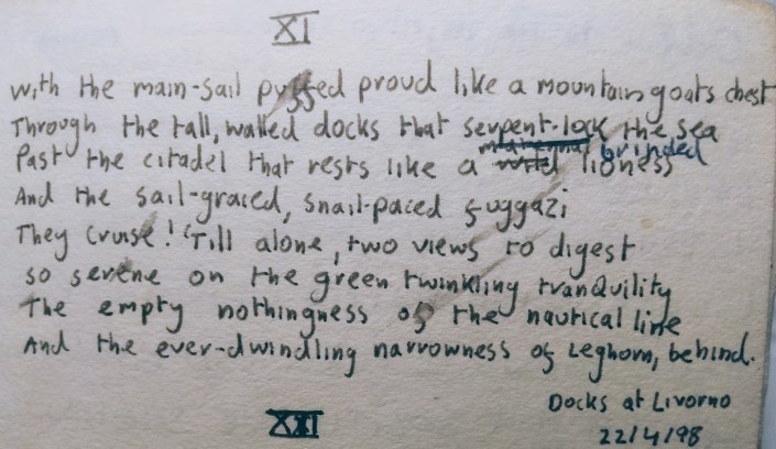 Woke early in Livorno, about 08.30, so went for a little stroll to the docks. It was mostly uninteresting, not as pleasanat a vibe as Portsmouth, but I did get a rather fine stanza, & being on the spot really help’d the flow.