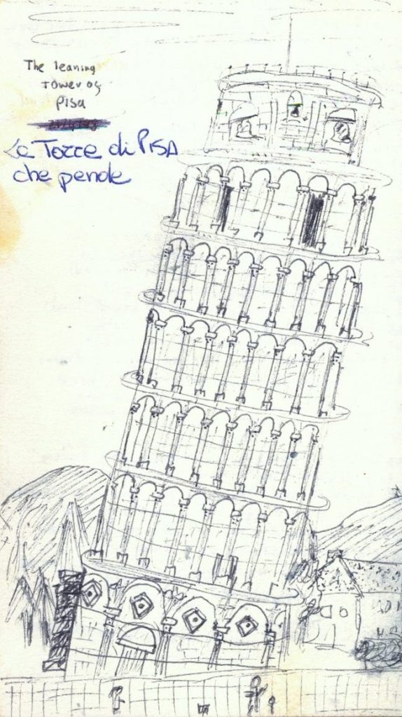 The day pass’d quite dreamlike – I got a couple more stanzas & even managed to sketch the leaning tower of Pisa! Art is always a hit or miss affair with me – mainly a miss – but it turne’d out quite good, I think. Even Kapitano was impress’d.